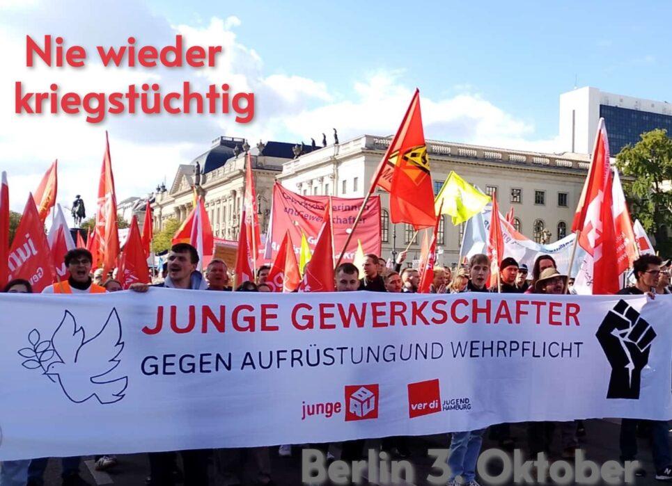 Am 3. Oktober auf der zentralen Friedensdemonstration in Berlin haben sich erneut hunderte von Gewerkschafter:innen – GEW, IG BAU , ver.di, IG Metall – von Berlin und Hamburg gegen den aktuellen deutschen Kriegs- und Großmachtkurs zusammengeschlossen. Neben den Forderungen gegen die Militarisierung der ganzen deutschen Gesellschaft brachten sie auch wieder ihre Solidarität mit den Menschen in Gaza zum Ausdruck.